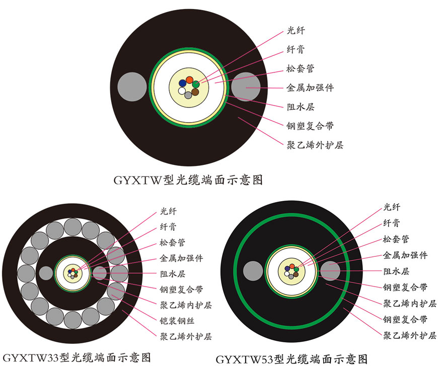 皺紋鋼帶鎧裝結(jié)構(gòu)增強了光纜抗側(cè)壓、防彈、防潮性能。