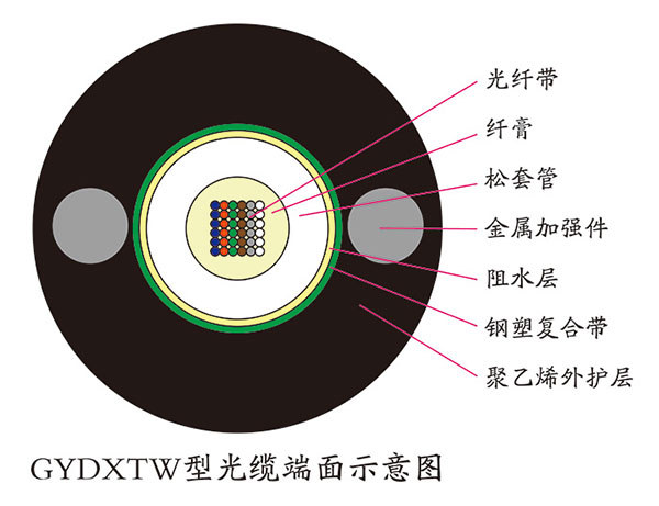 金屬加強(qiáng)構(gòu)件、光纖帶中心管填充式、夾帶鋼絲的鋼-聚乙烯粘結(jié)護(hù)套通信用室外光纜